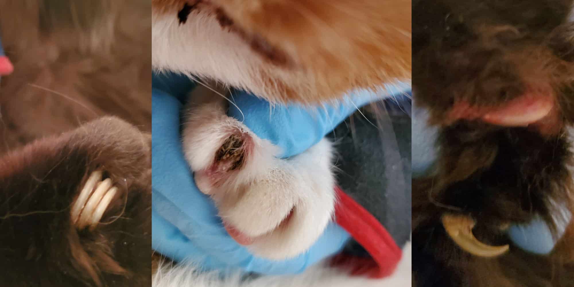 Nails growing into and through the paw pad or stuck in carpet almost ripped out of the nail bed.